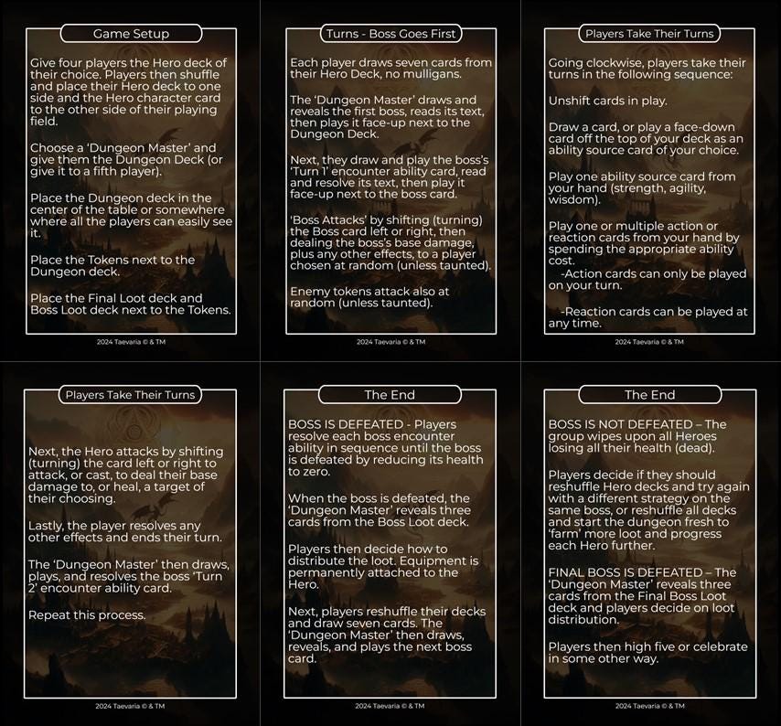Taevaria is a tabletop game where TCG meets RPG. You and three other players each play a Hero deck, featuring a unique Hero character card and a 50-card play deck with spells and abilities. Players will then face a PVE dungeon or raid deck, full of unique bosses, minions, and spells.